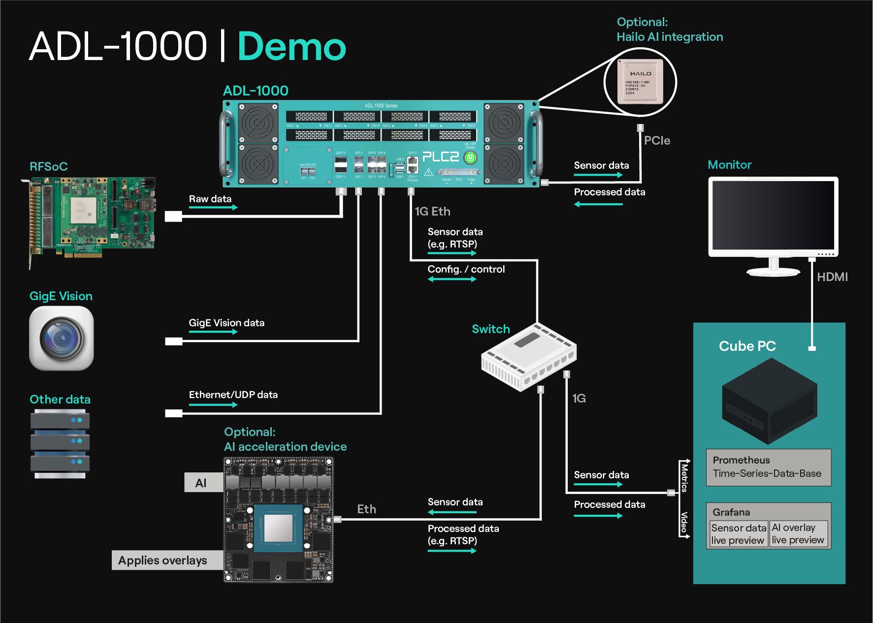 In the following use case, GigE Vision cameras are directly connected to the ADL-1000. The camera data is recorded, analysed (detection of objects) and stored on the NVMe devices. While the camera data is recorded, it is also provided to a Nvidia Jetson board, which is doing the AI calculation of the camera data. In parallel, the camera data is also provided to an external small cube PC, where a Prometheus database and a Grafana server is running. In addition to the camera data, sensor data (metrics) are also provided to the connected PC. With the help of the PC, an external monitor and the Grafana web interface, it is possible to monitor temperatures, the recording speed of the NVMe devices and the result of the AI classification (and many more).